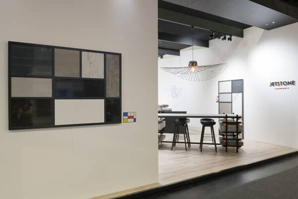 Andere nieuwe kleuren presenteerden we in een aantal Mondriaan-achtige schilderijen. De nieuwe keramiekkleuren Volcano Grigio en Volcano Nero leken op die manier bijna echte museumstukken, net als de nieuwe Noblesse-serie in composiet. Ook in de materiaalsoort Dekton konden we al een voorproefje tonen van enkele nieuwe kleuren, waarover later dit jaar meer nieuws zal volgen.
