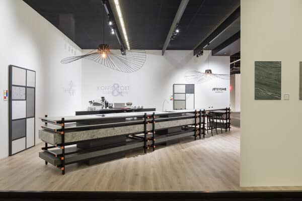 Van 14 t/m 18 januari stonden we op de beurs Living Kitchen, onderdeel van de IMM in Keulen. Voor onze stand, ontworpen naar een idee van Perry Hanssen (Hanssen ID), hebben we inspiratie gehaald uit de Nederlandse kunstgeschiedenis. Zo stond er een 8 meter lange bar geïnspireerd op de befaamde stoel van Rietveld. Hier lieten we bezoekers onder andere kennis maken met de nieuwe keramieksoort Ceppo de Gré en toonden we de composietkleur Airy Concrete van Caesarstone in een groot formaat. In de bar verwerkten we ook de nieuwste spoelbak van Franke; de ERA. Doordat deze spoelbak volledig geïntegreerd is, krijgt deze een bijzonder luxueuze uitstraling.